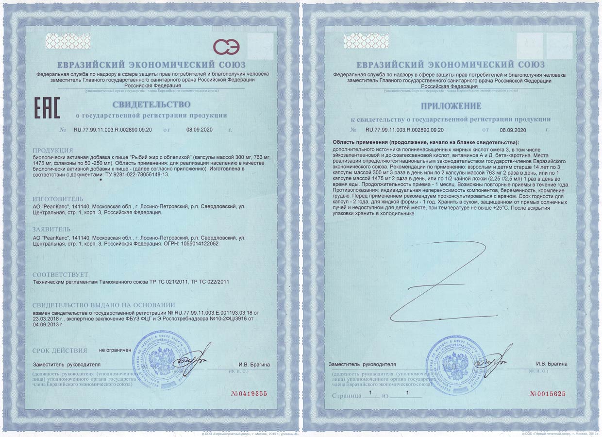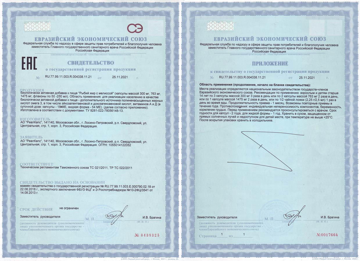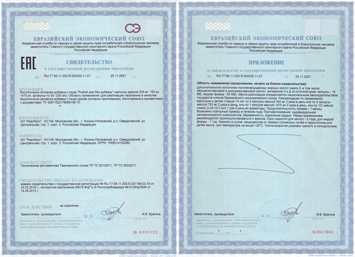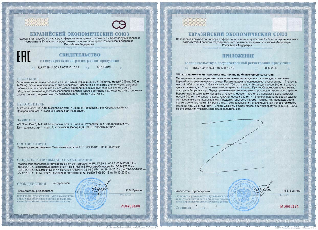 “Purified Fish Oil” is registered by the Russian Federal Service for Surveillance on Consumer Rights Protection and Human Wellbeing (Rospotrebnadzor). Certificate of State Registration No.RU.77.99.11.003.R.003715.10.19 dated 08.10.2019, Technical Specifications (TS) 9281-023-78056148-13 with changes No.1, 2.