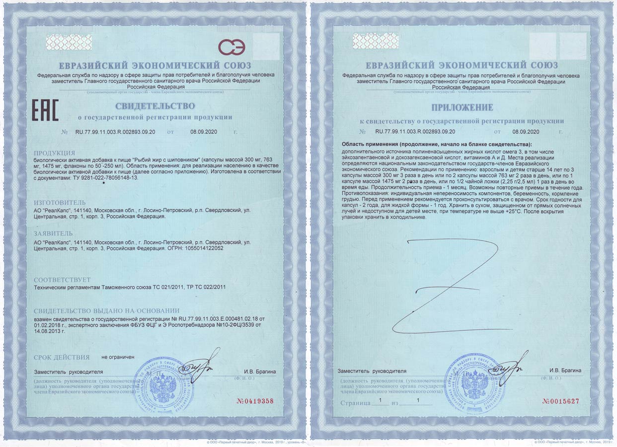 “Fish Oil with Rose Hips” is registered by the Russian Federal Service for Surveillance on Consumer Rights Protection and Human Wellbeing (Rospotrebnadzor). Certificate of State Registration No. RU.77.99.11.003.E.001194.03.18 dated 23.03.2018, Technical Specifications (TS) 9281-022-78056148-13.