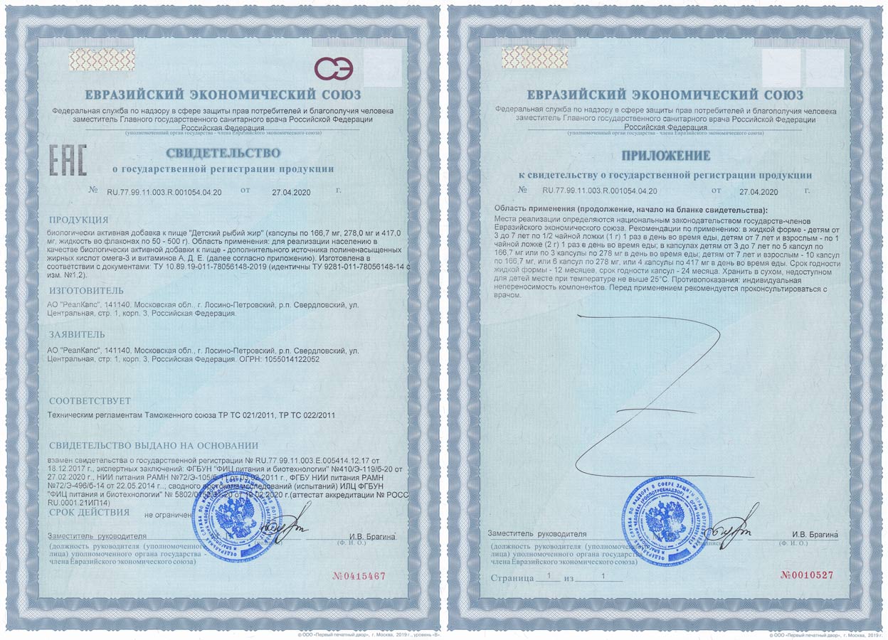 “Child’s Fish Oil” is registered by the Russian Federal Service for Surveillance on Consumer Rights Protection and Human Wellbeing (Rospotrebnadzor). Certificate of State Registration No.RU.77.99.11.003.Е.004965.03.15 dated 20.03.2015. Technical Specifications TS 9281-011-78056148-2014.