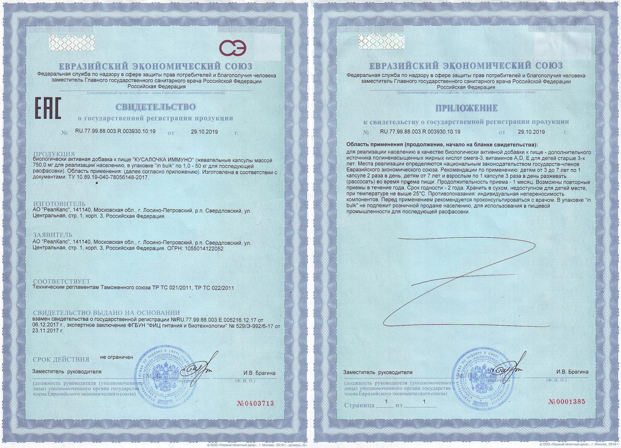 KUSALOCHKA® IMMUNO has the registration of the Russian Federal Service for Surveillance on Consumer Rights Protection and Human Wellbeing (Rospotrebnadzor). Certificate of State Registration No. RU.77.99.88.003.R.003930.10.19 dated 29.10.2019. Technical Specifications (TS) 10.89.19-040-78056148-2017.