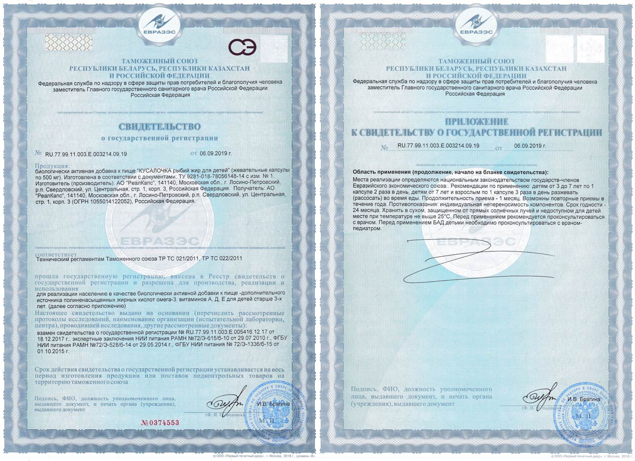 “Child’s fish oil KUSALOCHKA®” is registered by the Russian Federal Service for Surveillance on Consumer Rights Protection and Human Wellbeing (Rospotrebnadzor). Certificate of State Registration No. RU.77.99.11.003.E.003214.09.19 dated 06.09.2019. Technical Specifications (TS) 9281-018-78056148-14 with change No.1.